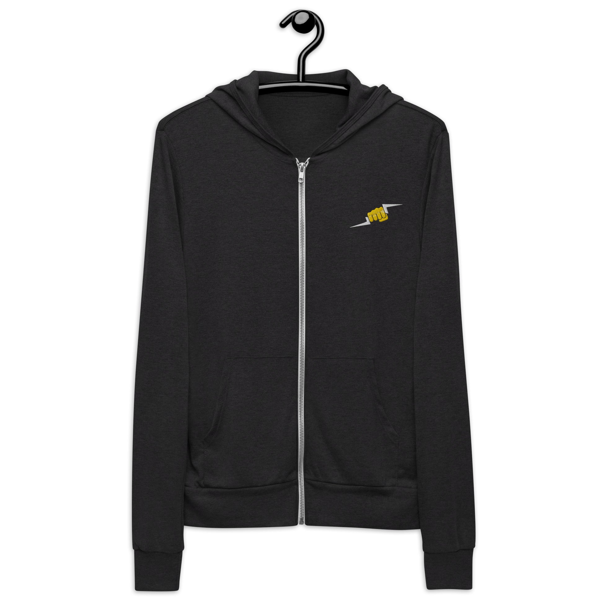 Sometimes you clap back so cold, you need something comfy to throw on. Dig this lightweight zip hoodie with a modern fit, hood, front zip, embroidered fist and bolt.